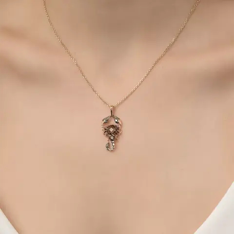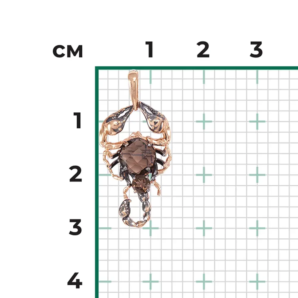 Подвеска-скорпион из красного золота 585 пробы, с натуральными камнями. Дизайн украшения объёмный, в стиле анималистика. Силуэт скорпиона символизирует защиту и справедливость. Изделие декорировано дымчатыми кварцами – огранки бриолет и круг. Дополняет дизайн родиевое покрытие. Закрепка камней и родирование выполнены вручную. Подвеска подойдёт в качестве коктейльной, для вечерних мероприятий и бизнес-встреч, а также к повседневному или деловому гардеробу.
