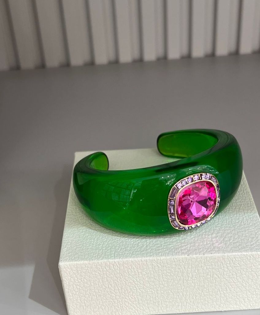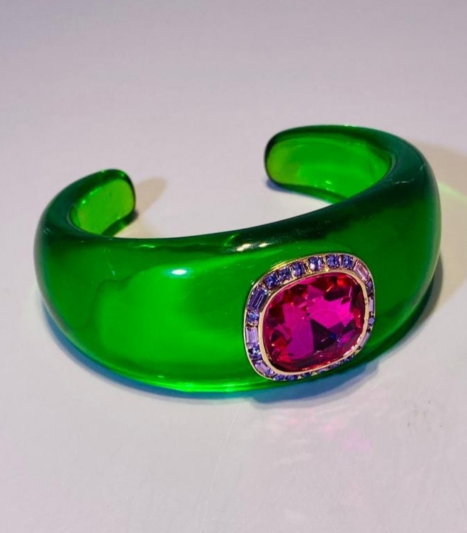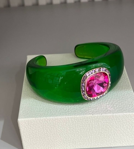 Браслет манжета из акрила трявяного цвета с малиновой вставкой