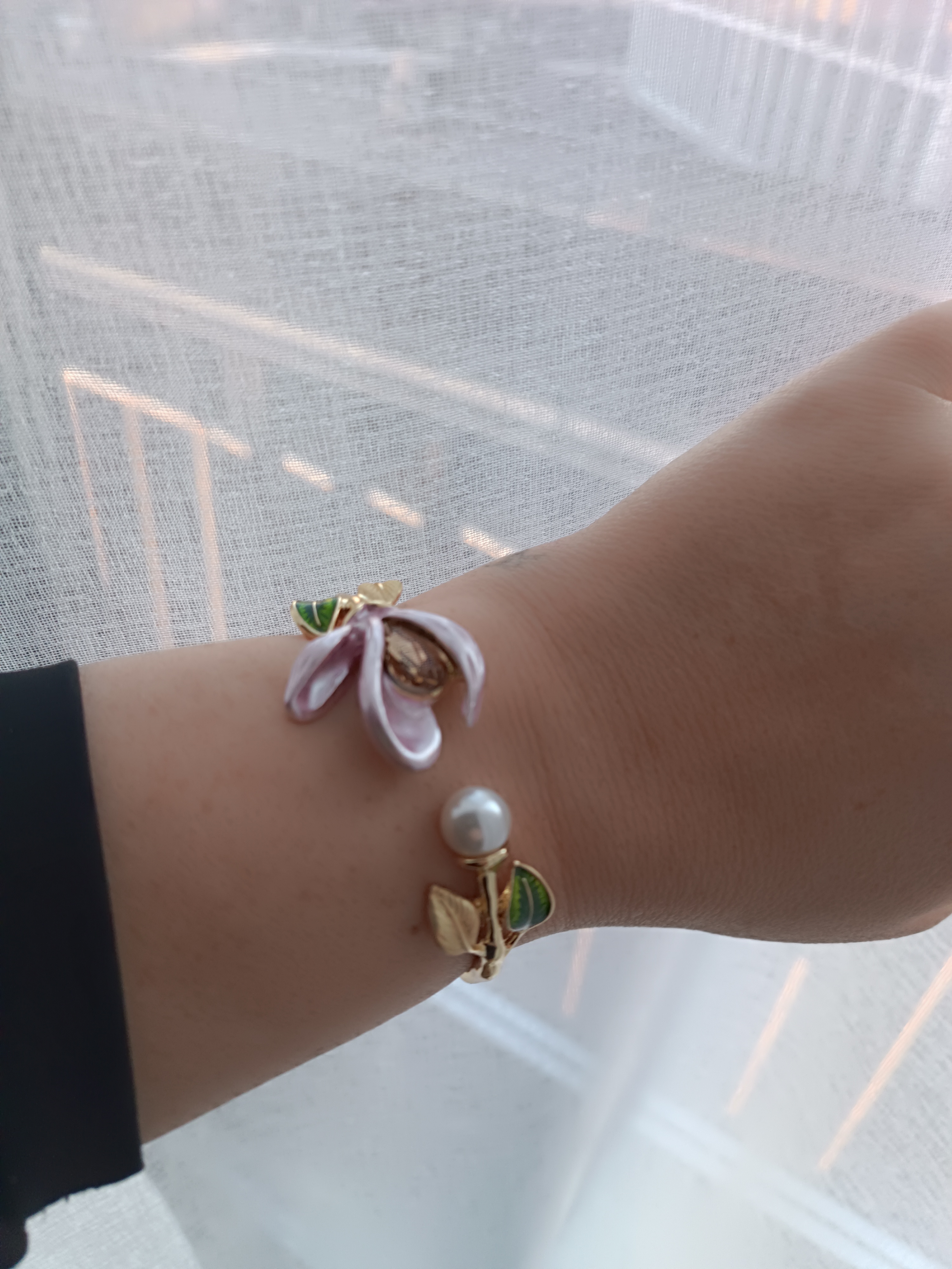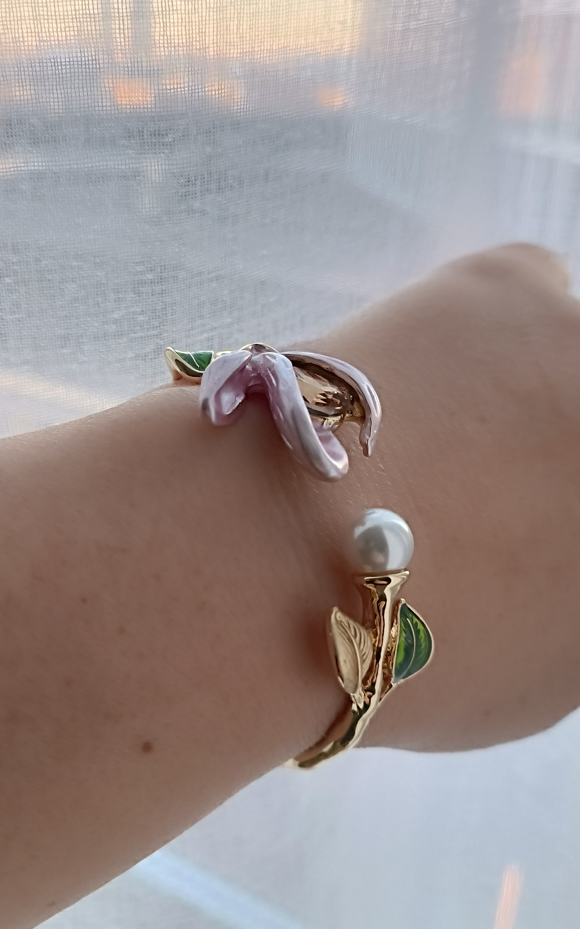 Браслет жесткий НЕЖНОСТЬ в стиле BRUNI с розовой, холодной эмалью