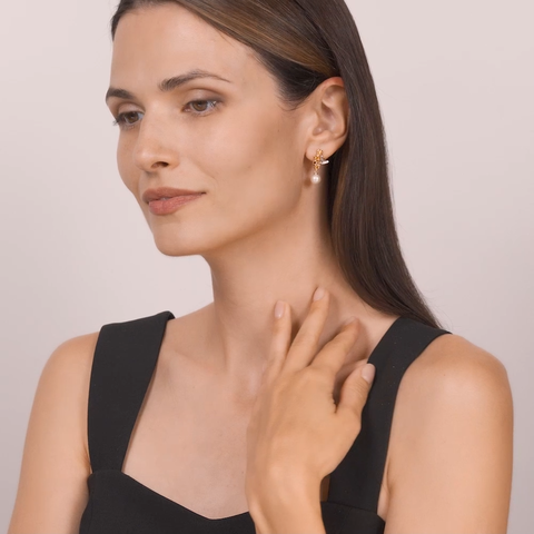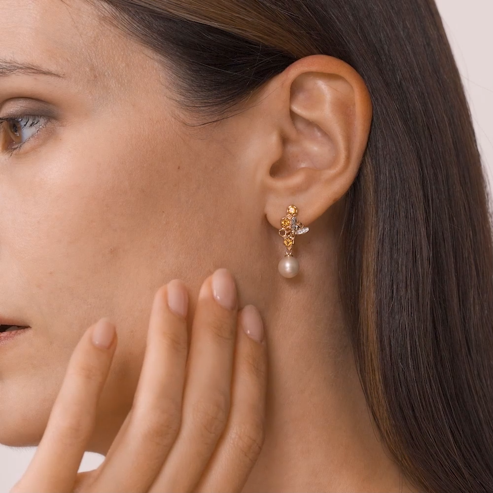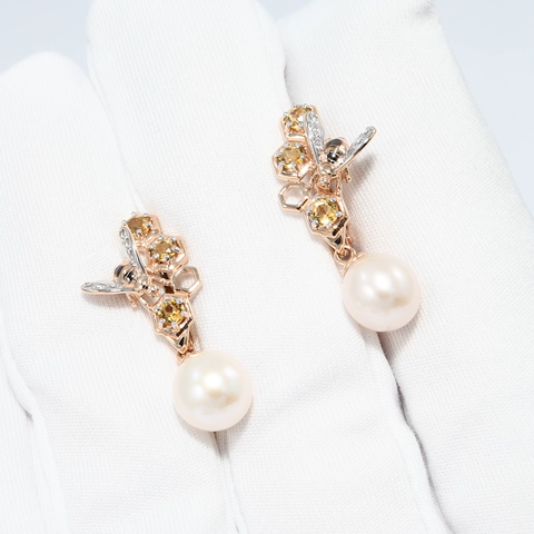 792382 - Серьги ПЧЕЛЫ из золота 585 пробы с подвесками из жемчуга и цитринами