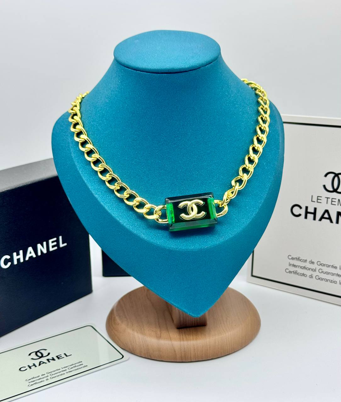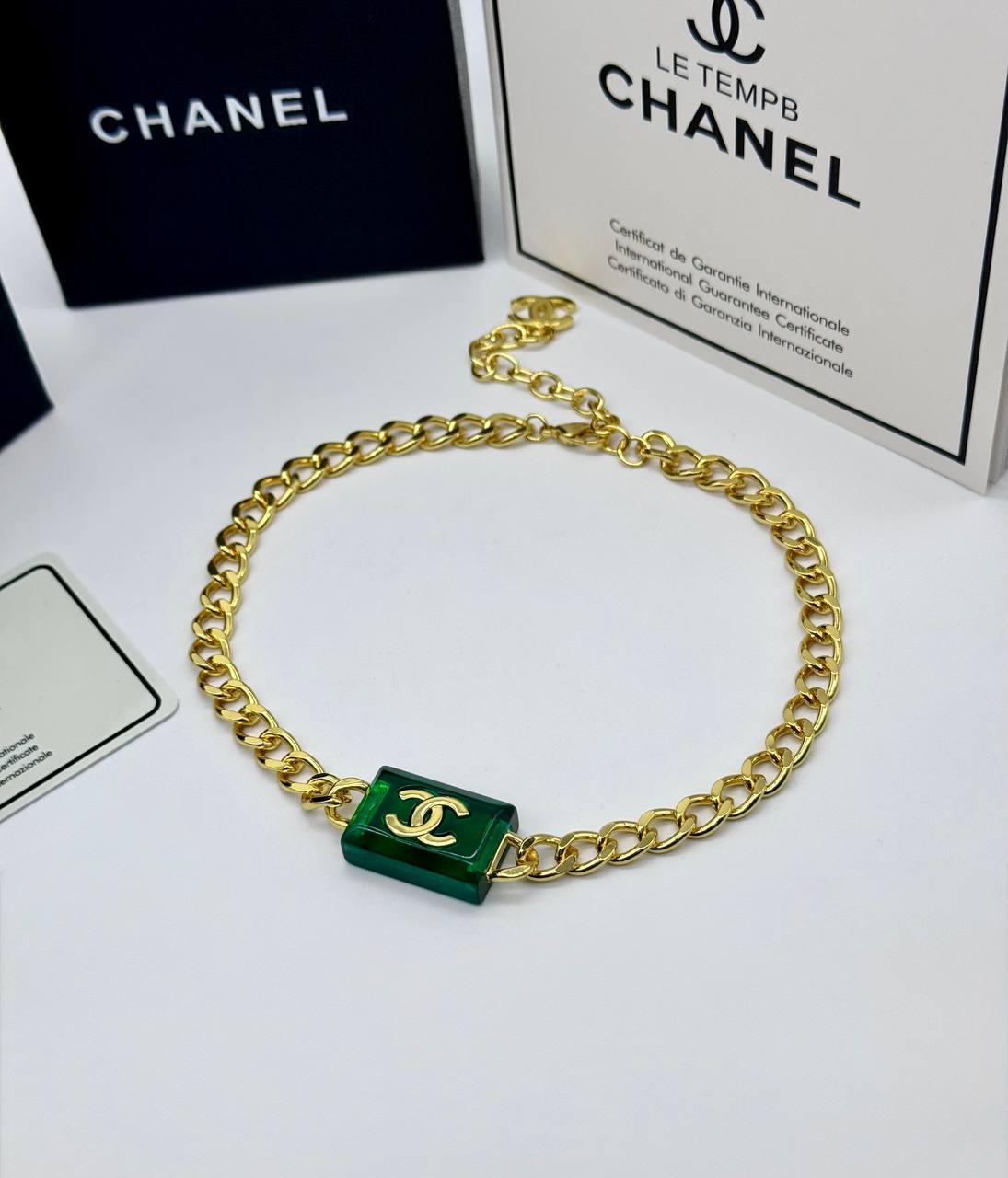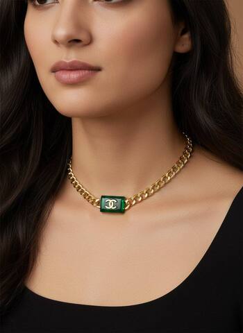 Колье-цепь CHANEL с зелёной прямоугольной вставкой