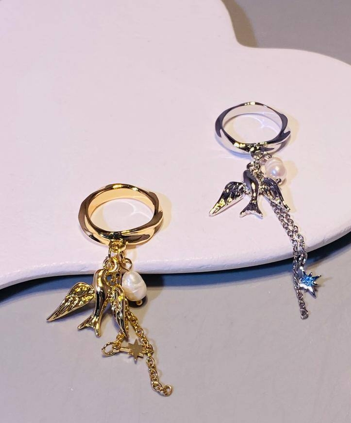 Кольцо с подвесками птицы в стилистике POISON DROP матовое золото/серебро