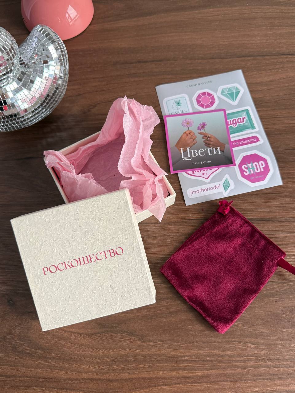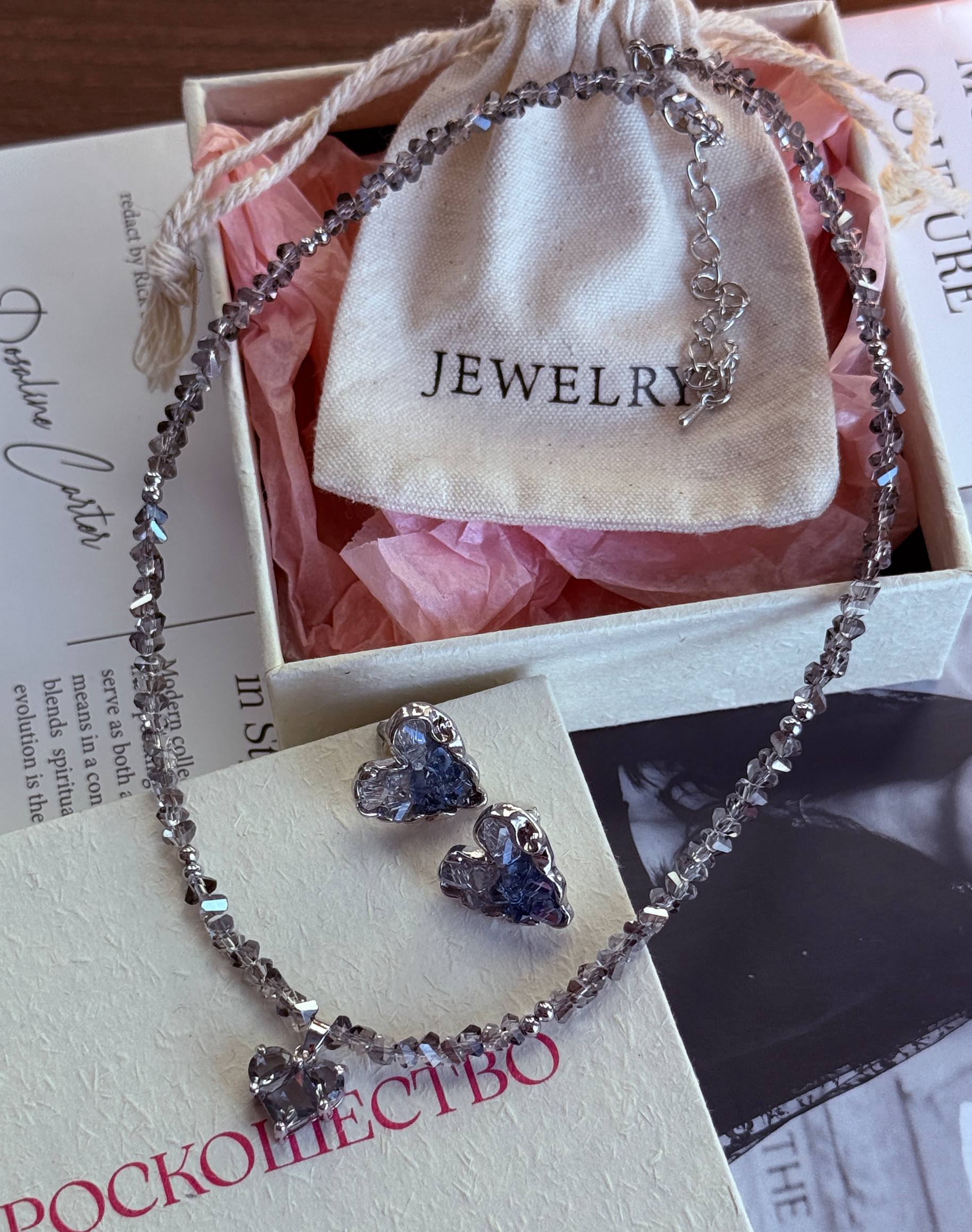 В комплекте: колье + браслет + упаковка ( мешочек, коробочка с надписью роскошество, стикеры. открытка Сияй)
