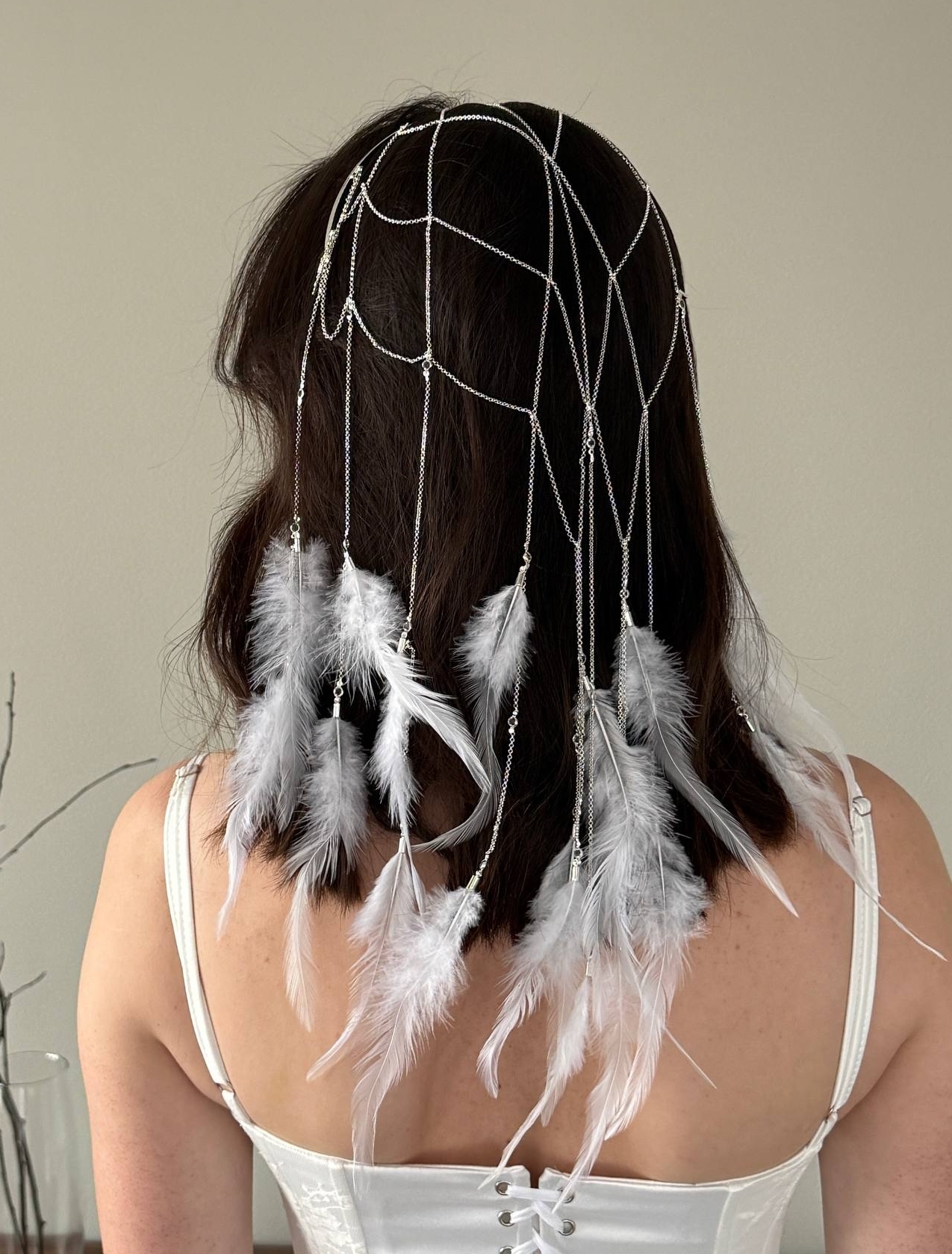 Украшение свадебное на голову тика с подвесками перышками