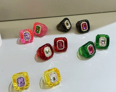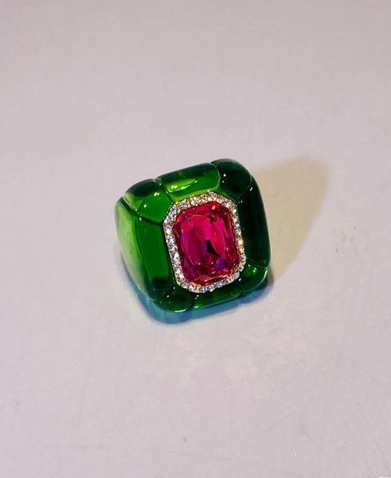 84512 - Кольцо печатка из акрила цвета зелёной травы с камнес цвета фуксия