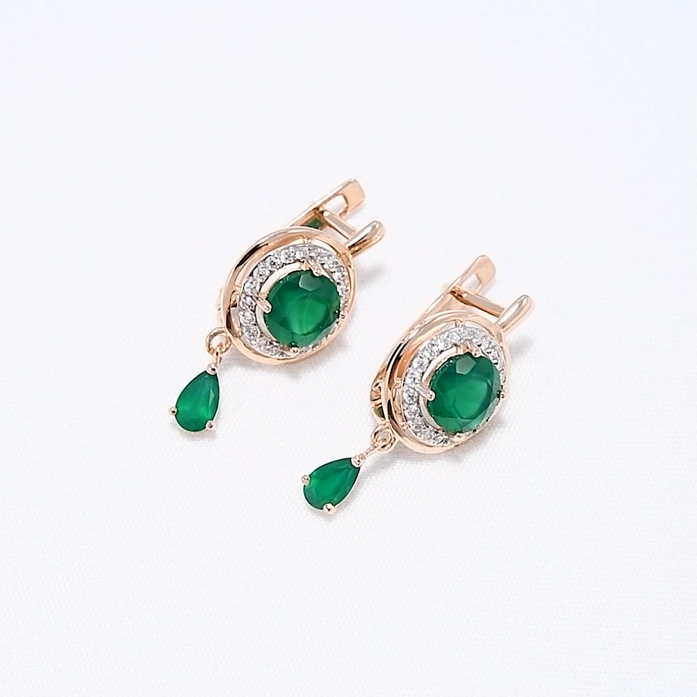 Серьги из золота 585 пробы с зелеными агатами и фианитами