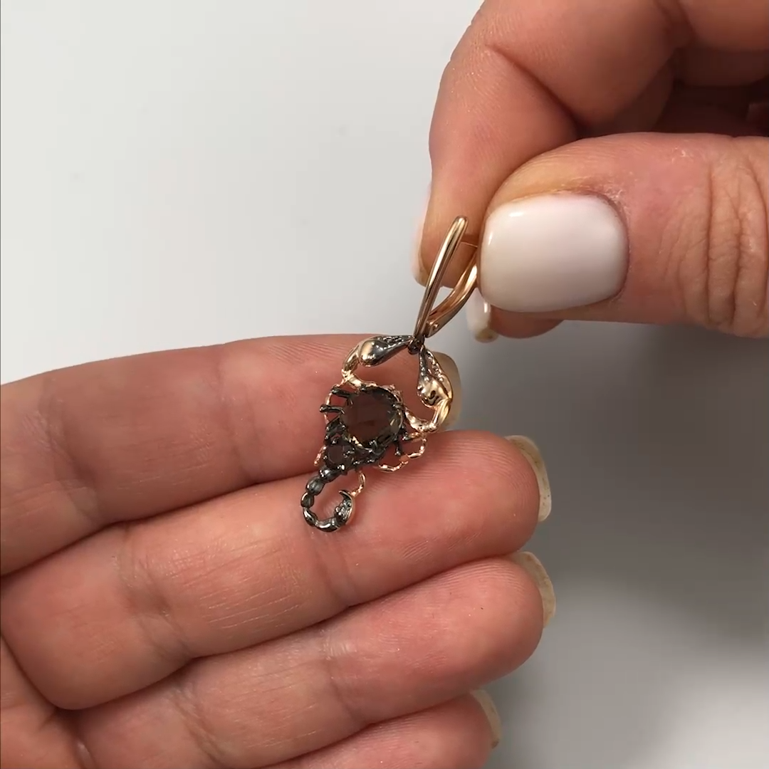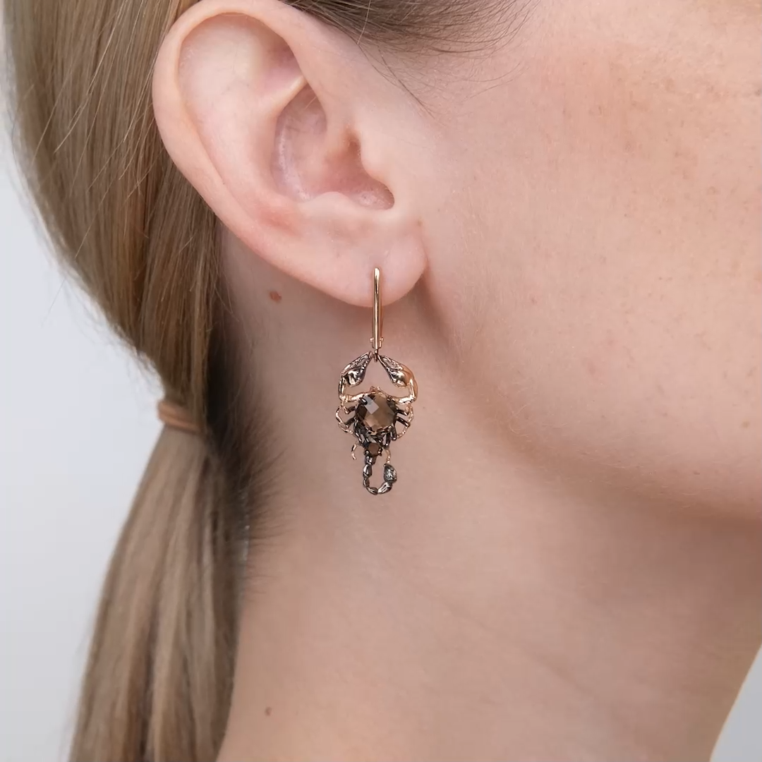 Серьги «Скорпионы» с английским замком из красного золота 585 пробы с кварцем дымчатым из коллекции Большой замысел от ювелирного бренда PLATINA. Дизайн украшения выполнен в стиле анималистика. Скорпион — символ мистики и смерти, вечности и непознанности. Родирование и закрепка камней выполнены вручную.
