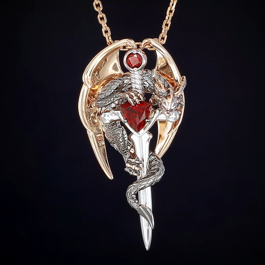 Подвеска «Дракон на мече» из красного и белого золота с натуральными гранатами из коллекции «Большой замысел» от ювелирного бренда PLATINA. Дизайн украшения фантазийный, детализированный. Дракон с мечом символизирует мудрость, власть, богатство, где меч ? знак Доброй силы, высшей справедливости и лидерства. Подвеска инкрустирована натуральными гранатами. Тело дракона покрыто чёрным родием, что добавляет эффектность ювелирному образу. Родирование и закрепка камней выполнены вручную. Украшение станет выразительным и символичным акцентом как в мужском, так и женском образах. Артикул 03-3495-00-204-1111.
