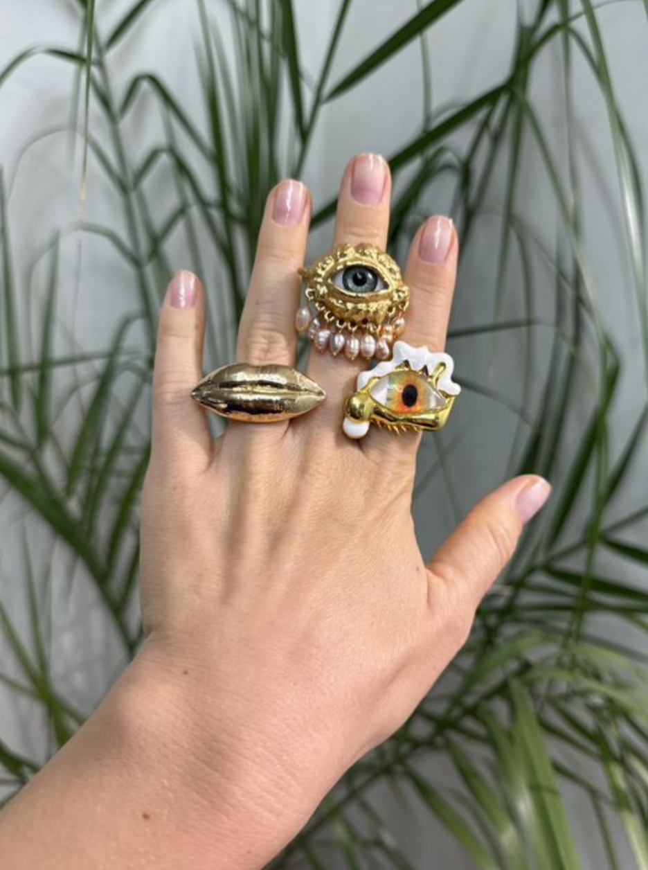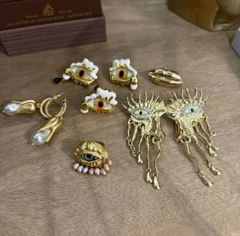 Комплект серьги + кольцо EGG with EYE в стиле Schiaparelli с белой эмалью