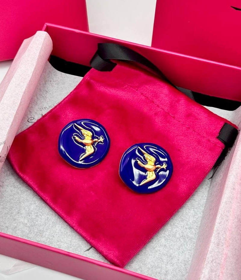 Серьги-пусеты ГОЛУБЬ МИРА в стиле Schiaparelli с белой/синей эмалью