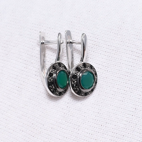 92021545 - Серьги из серебра с темно-зелеными агатами и марказитами