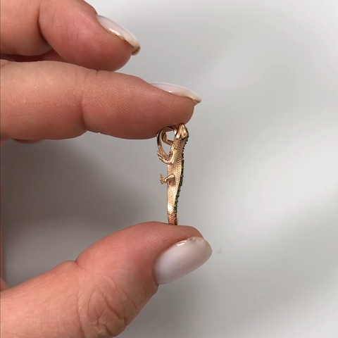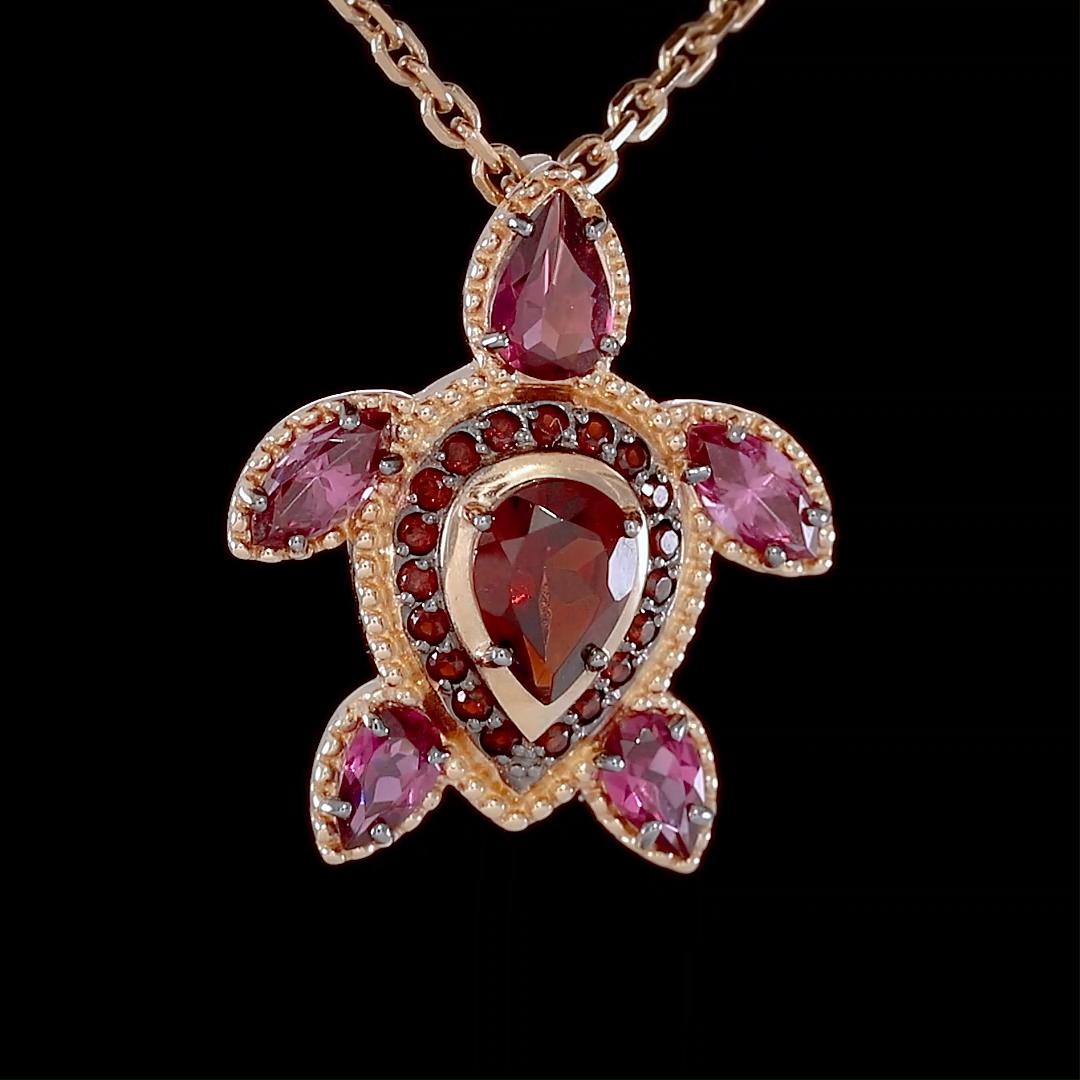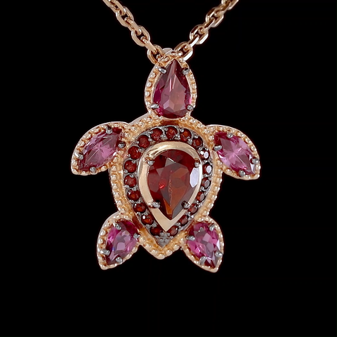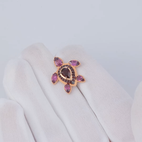 Подвеска-черепаха из красного золота 585 пробы с цитринами и дымчатыми кварцами. Дизайн украшения – стилизованная, фантазийная анималистика. В центре композиции расположен наиболее крупный гранат-пироп огранки груша. Более мелкие камни – гранаты-родолиты – расположены в изголовье и на «лапах» черепахи, а миниатюрные пиропы повторяют силуэт её «брюшка». Дизайн дополнен золотыми гранулами и тёмным родием. Подвеска подойдёт к деловому или casual (кэжуал) стилям, а также для светских или коктейльных мероприятий.